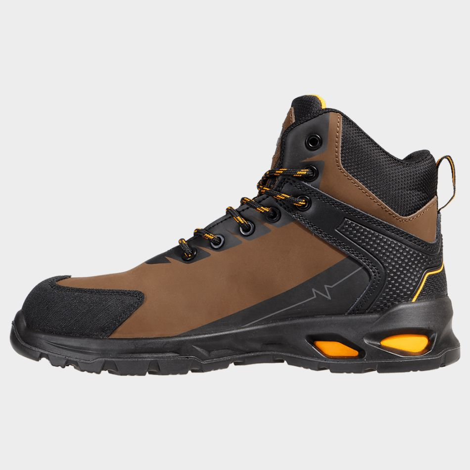 •   Partea superioara este confectionata din piele nabuc hidrofug, combinata cu detalii Oxford. Partea interioara este realizata din tesatura din plasa respirabila si rezistenta la uzura, asigurand o purtare confortabila si de lunga durata. Partea din fata a bocancilor este intarita cu fibra de sticla, care ofera rezistenta si protectie suplimentara. Lamela Kevlar® face pantofii mai puternici, fara a interfera cu flexibilitatea pantofului.