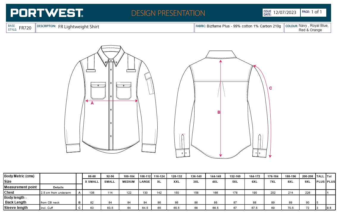 Camasa ignifuga antistatica cu benzi reflectorizante Portwest FR720, 99% bumbac, 1% fibra de carbon, 210 gr/mp