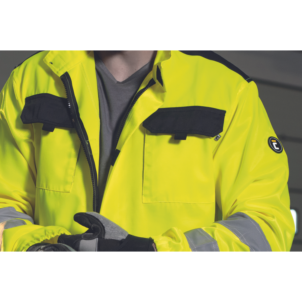 •    Jacheta de lucru unisex HI-VIS cu inchidere cu fermoar acoperita cu clapa, 2 buzunare laterale, 2 buzunare la piept cu clapa velcro, 2 benzi reflectorizante cusute de 5 cm pe laterale si pe maneci , zone intarite la nivelul umerilor, mansete si talie elastice