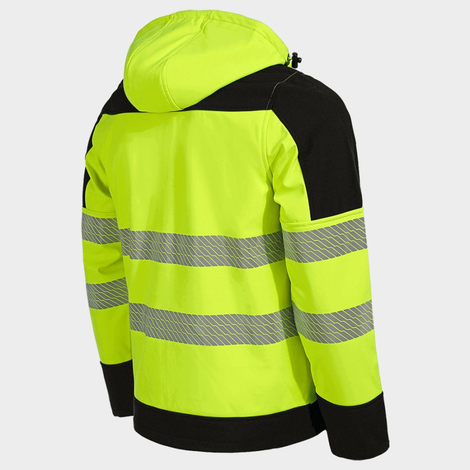 • Jacheta softshell de inalta vizibilitate, cu gluga si benzi reflectorizante pe maneci si corp, asigurand vizibilitate si siguranta ridicate.