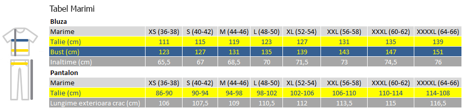 Instructiuni de utilizare: Se utilizeaza ca echipament de lucru. Pantalonul se va purta peste incaltaminte, iar bluza trebuie sa acopere pantalonii.