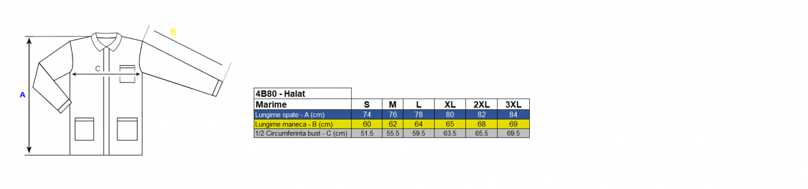 Marcare: Eticheta permanenta a produsului contine: codul, marimea, marcajul CE, compozitia tesaturii, dimensiunile corpului operatorului (circumferinta: torace, talie, inaltime) pictograme reprezentand instructiunile de intretinere.