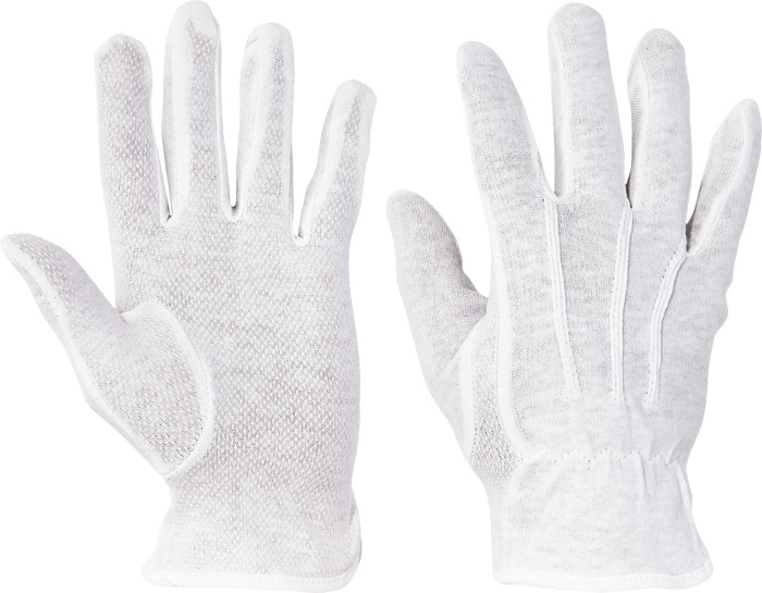 Manusi cusute - tricot interlock din bumbac albit, fara manseta, elastic pe dosul palmei la incheietura mainii, palma si degetele cu aplicatii marunte din PVC.
