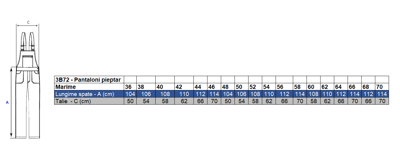 Constructie generala: Pantalonii cu pieptar au bretele reglabile prin catarama, un buzunar aplicat pe piept inchis cu fermoar, doua buzunare in partea din fata.